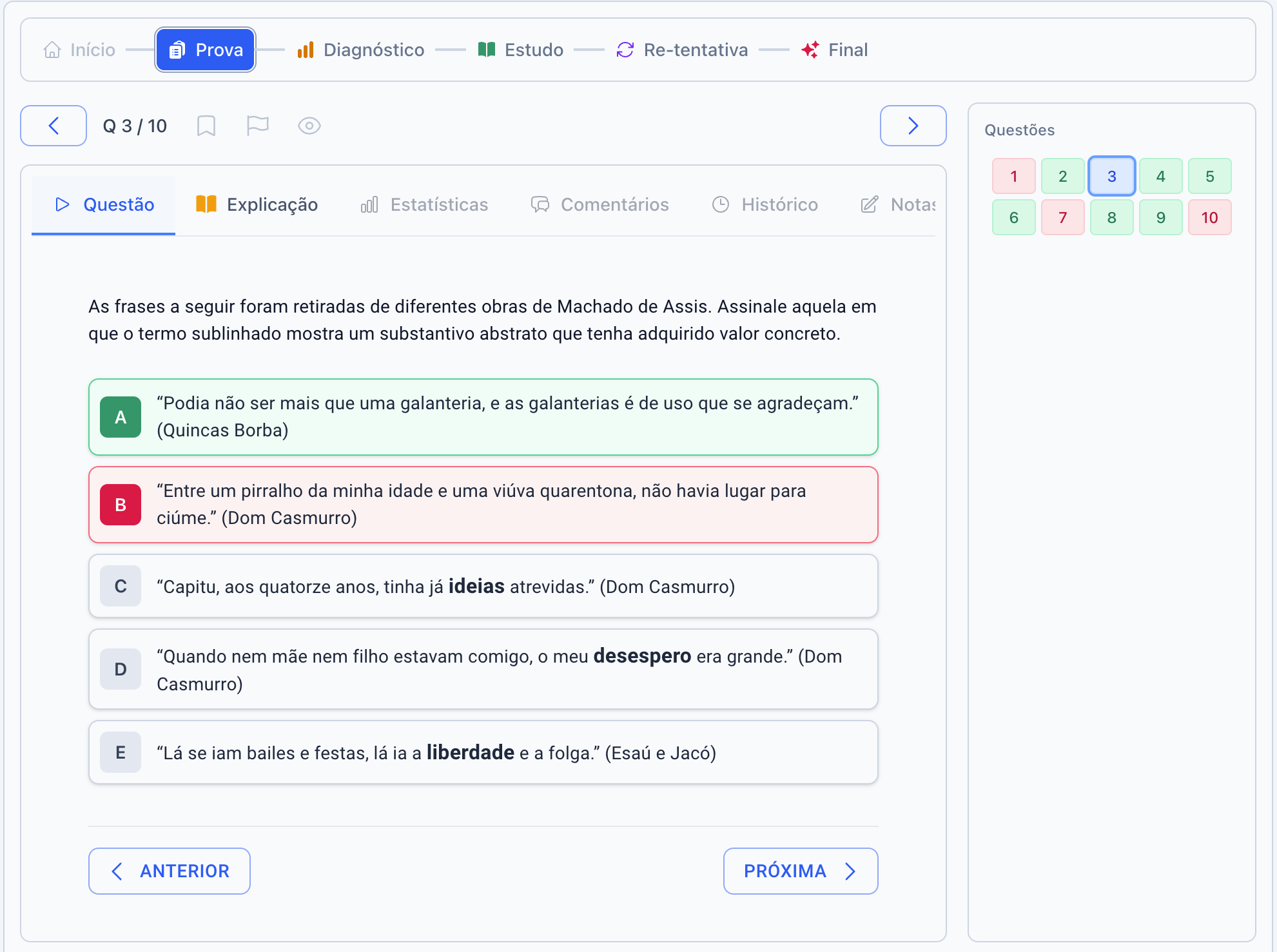 - Dados detalhados sobre suas acertos e erros