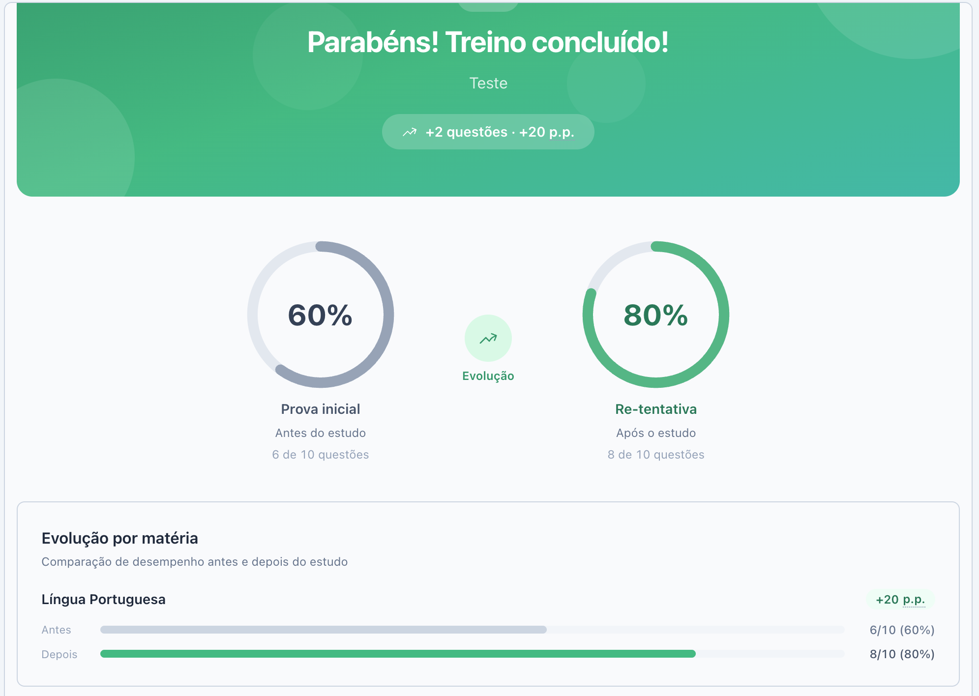 Aqui voce terá um comparativo entre o seu conhecimento antes e depois do estudo, deixando claro o quanto voce evoluiu
