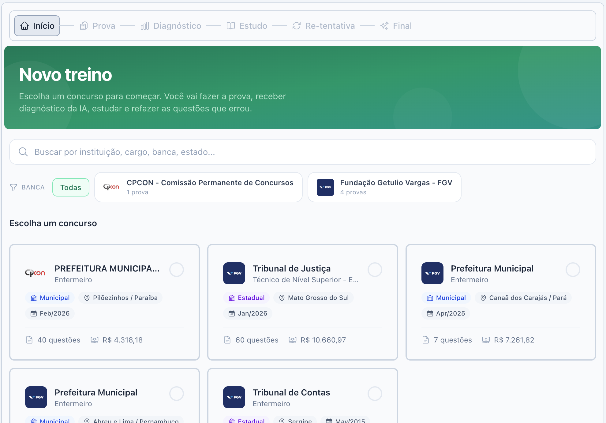 Aqui voce deverá escolher a prova que você quer treinar. O ideal é escolher uma prova recente da banca que você está estudando.